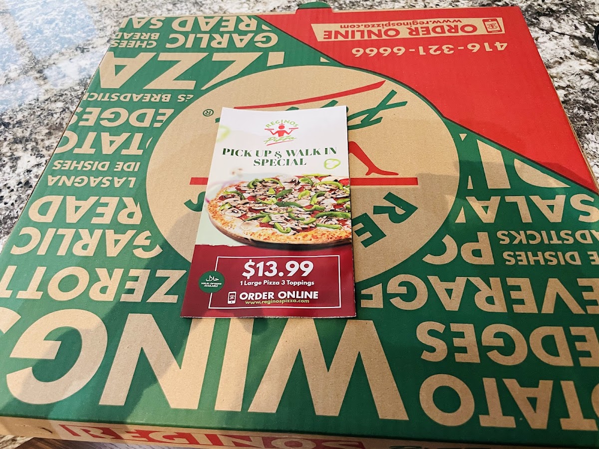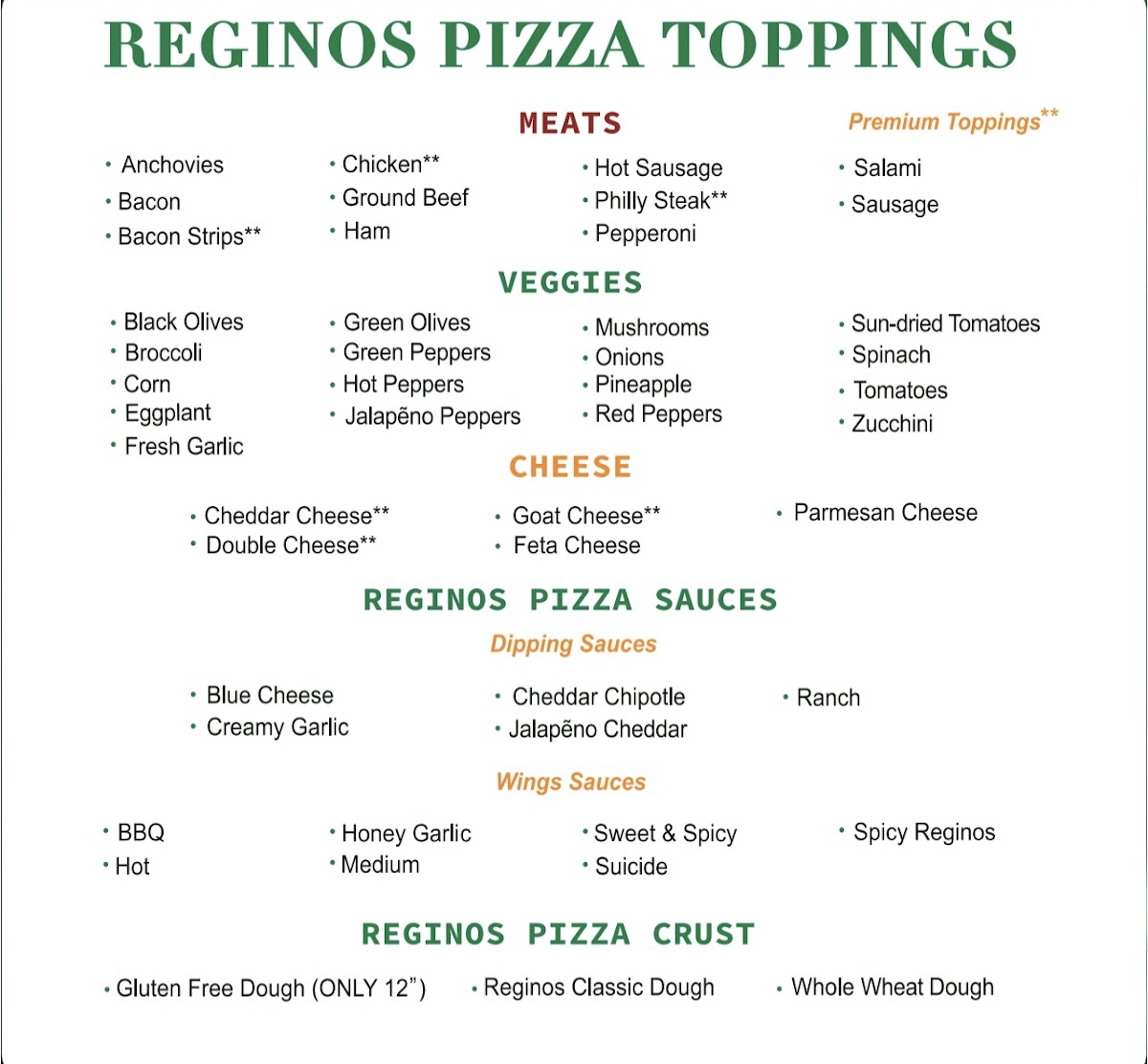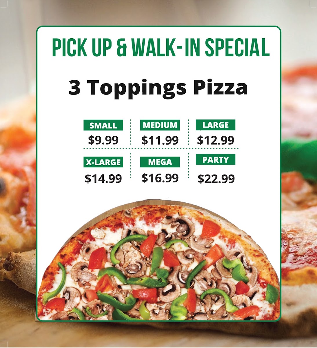 Pizza Selection: The pizza offerings include multiple size options ranging from small to extra large. Customers can choose from build-your-own pizzas where they select their preferred toppings, or opt for specialty pizzas including vegan varieties such as Small Vegan Pizza, Small Vegan Vegetarian Pizza, and Small Vegan Vegi Lover. Popular large and extra-large pizzas include classic choices like Pepperoni, Chicken Mediterranean, and Deluxe Pizza.